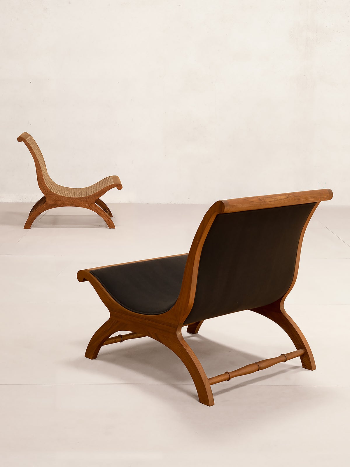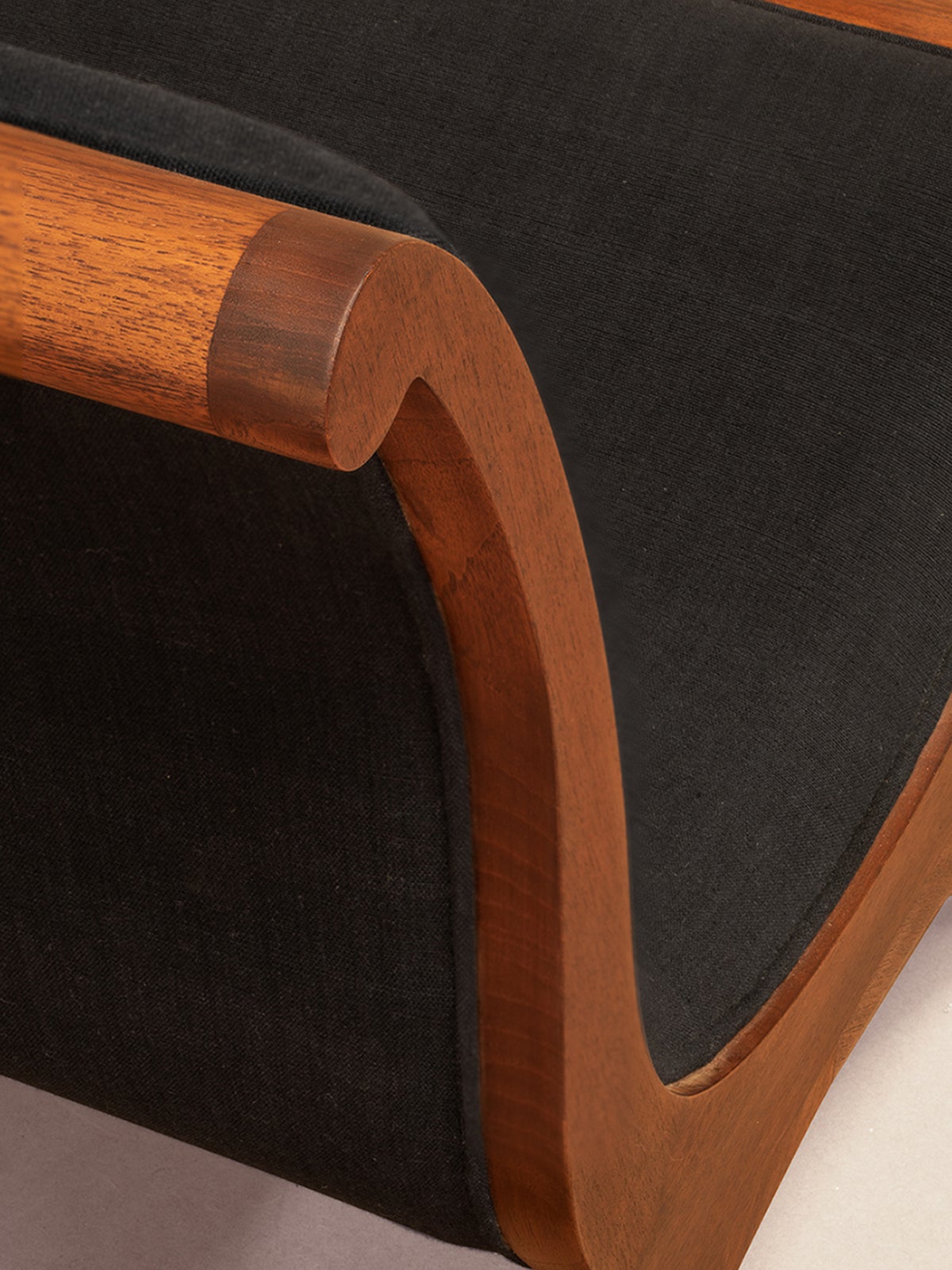 現代の製造工程に適応するため、木製フレームの厚みには調整が加えられていますが、側面のプロポーションはオリジナルの意匠を忠実に引き継いでいます。なお、籐張り仕様と張り地仕様では横木の意匠が異なっており、それぞれの仕様に見られる特徴は今回のリエディションでも丁寧に再現されています。黒の張り地には、バワが当時使用していたサプライヤー「ベアフット(Barefoot)」のファブリックが採用されています。